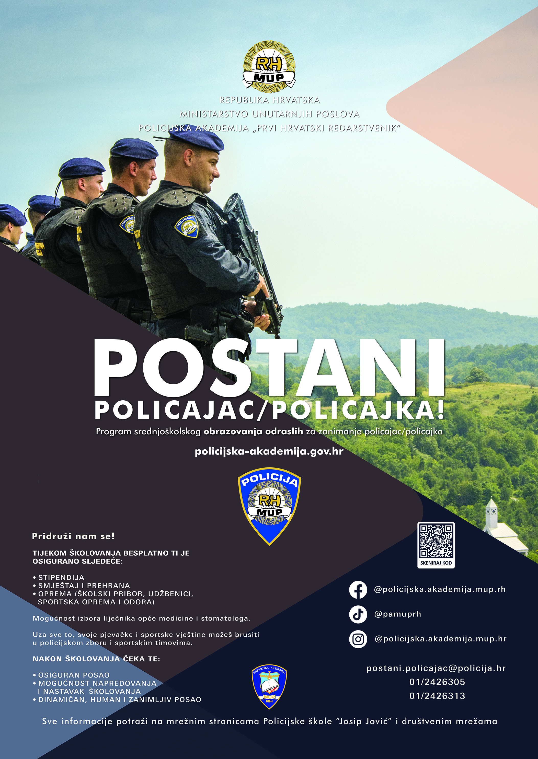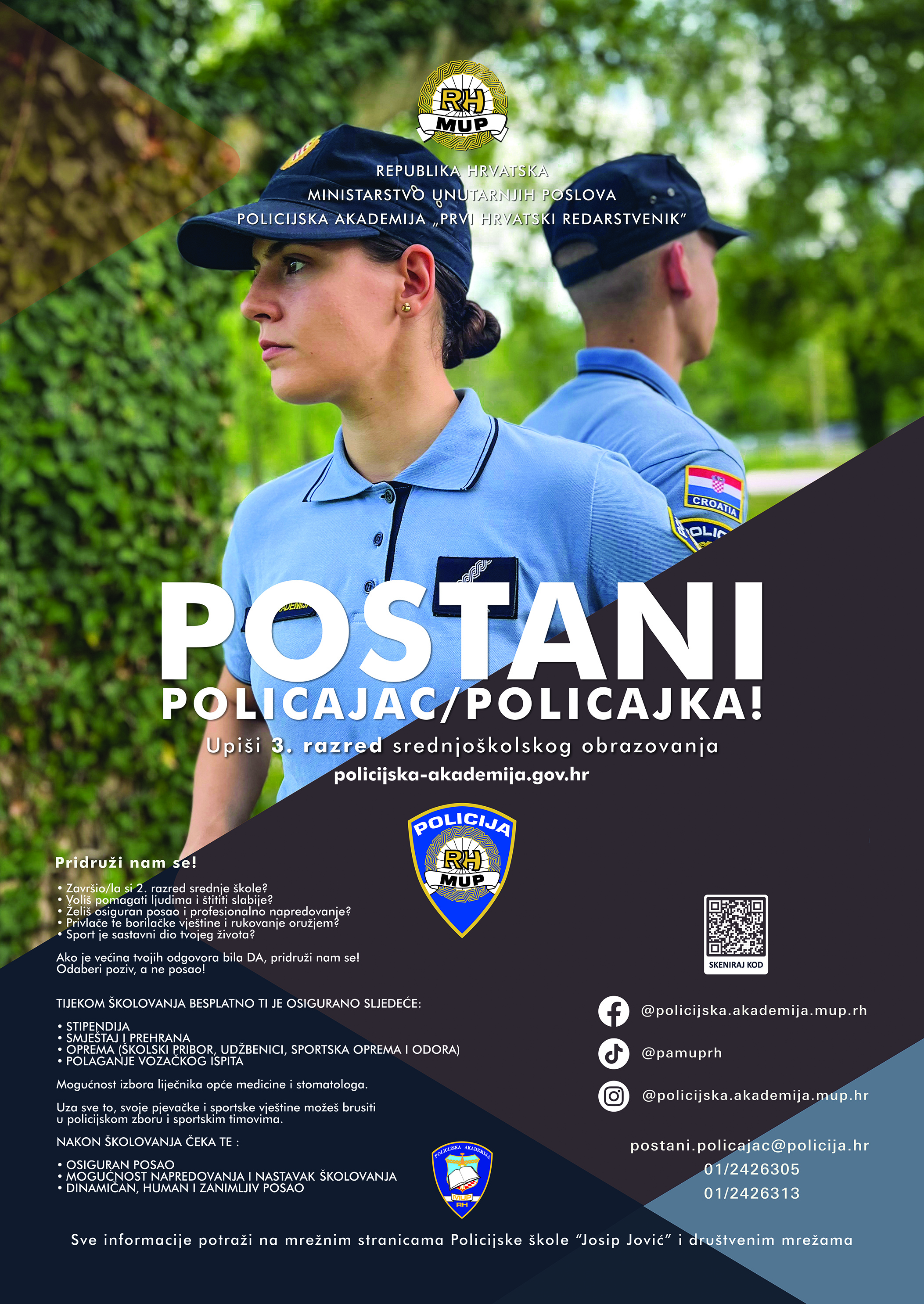 Detaljnije informacije o Programu srednjoškolskog obrazovanja odraslih za zanimanje policajac/policajka mogu se dobiti u Policijskoj školi „Josip Jović“ radnim danom od 7 do 15 sati: